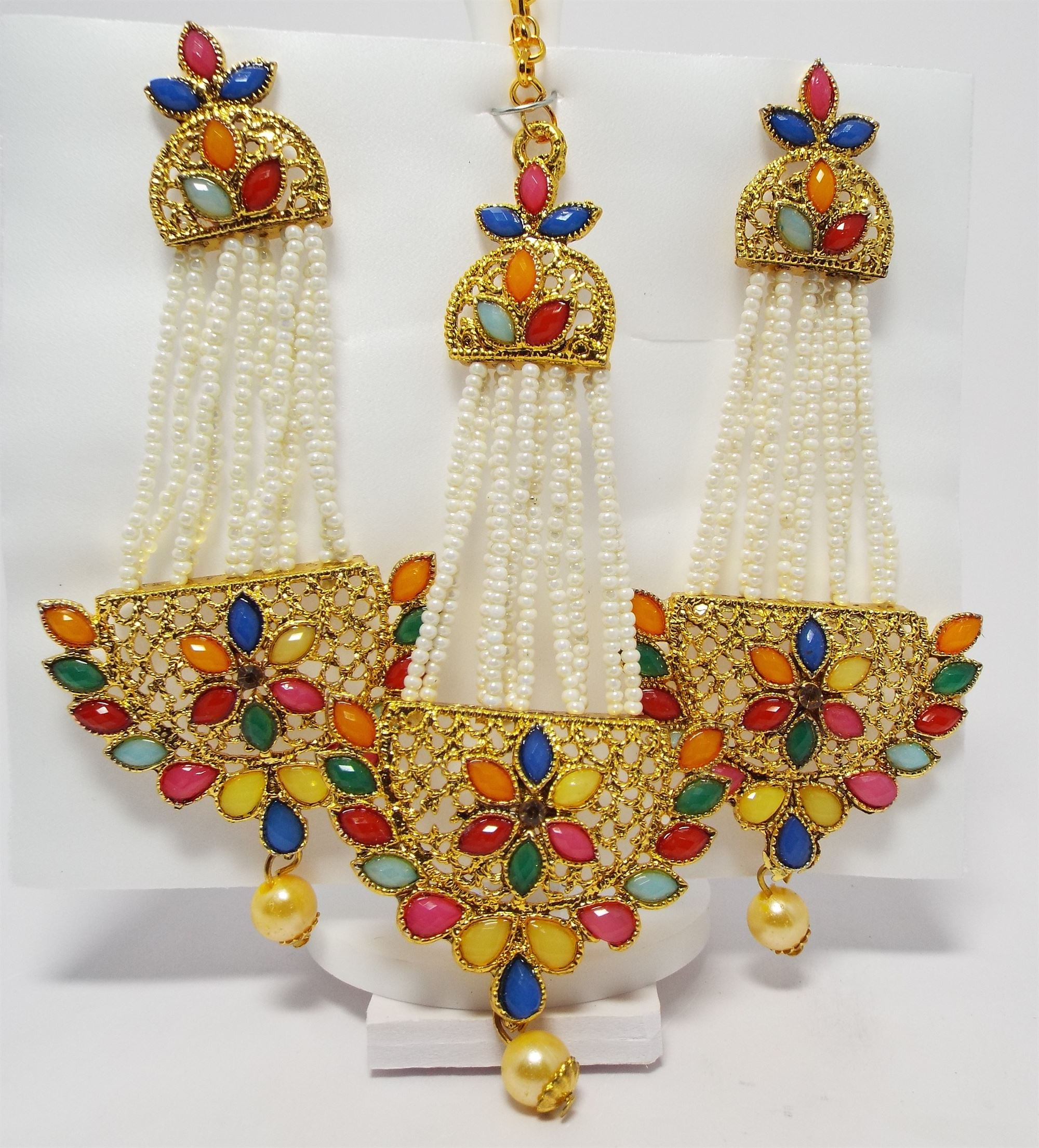 Buy Earrings with Tikka Set in different styles colors. Long Ethnic traditional Tikka With Earrings. Best traditional earrings wear with beautiful tikka set.