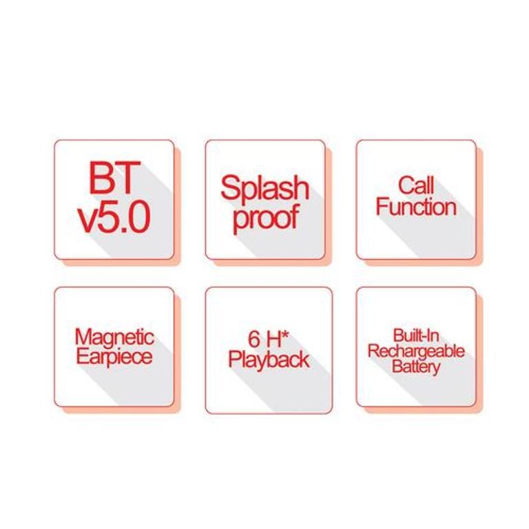 BT Version 5.1, Playback Time 6H*, Magnetic Earpiece, Built-in rechargeable battery
